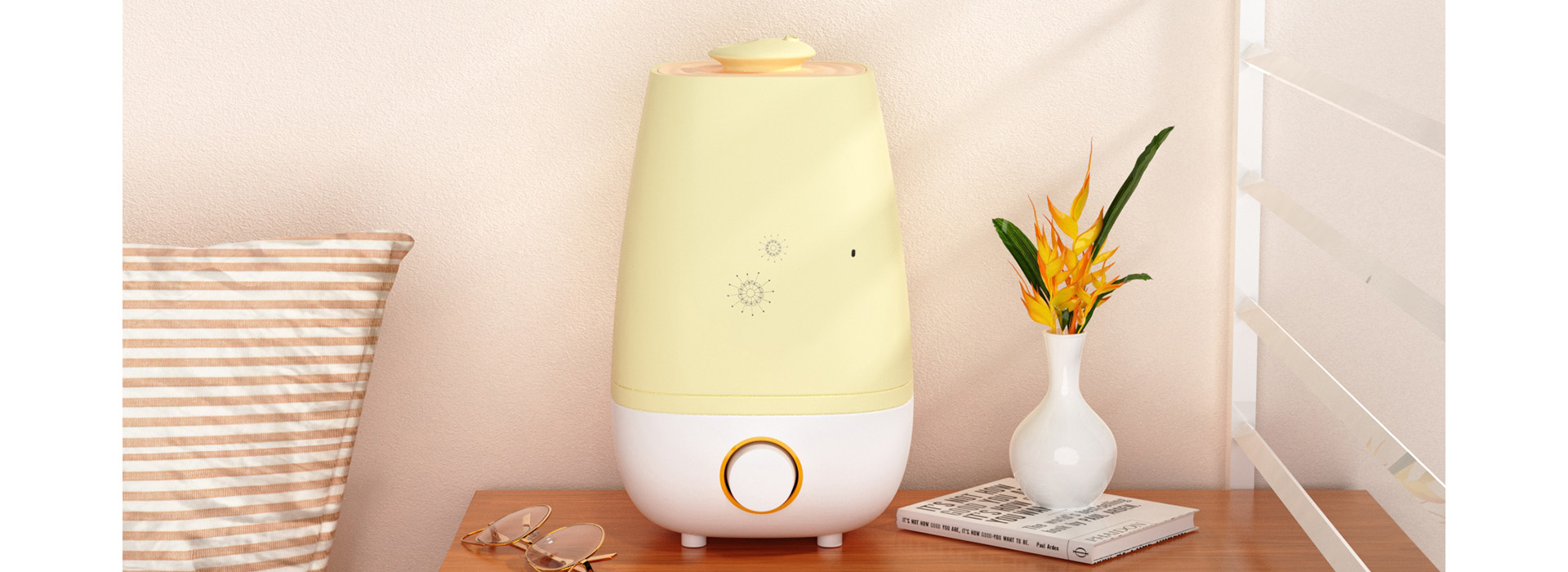 一款通过物理方式,增加室内空气湿度的加湿器 简约治愈的家居美学,整体呈圆润的流线型轮廓,弱化了硬质棱角,带来亲近感与柔和感。顶部的盖体设计或小巧圆润,既满足功能性,又让造型更具记忆点。