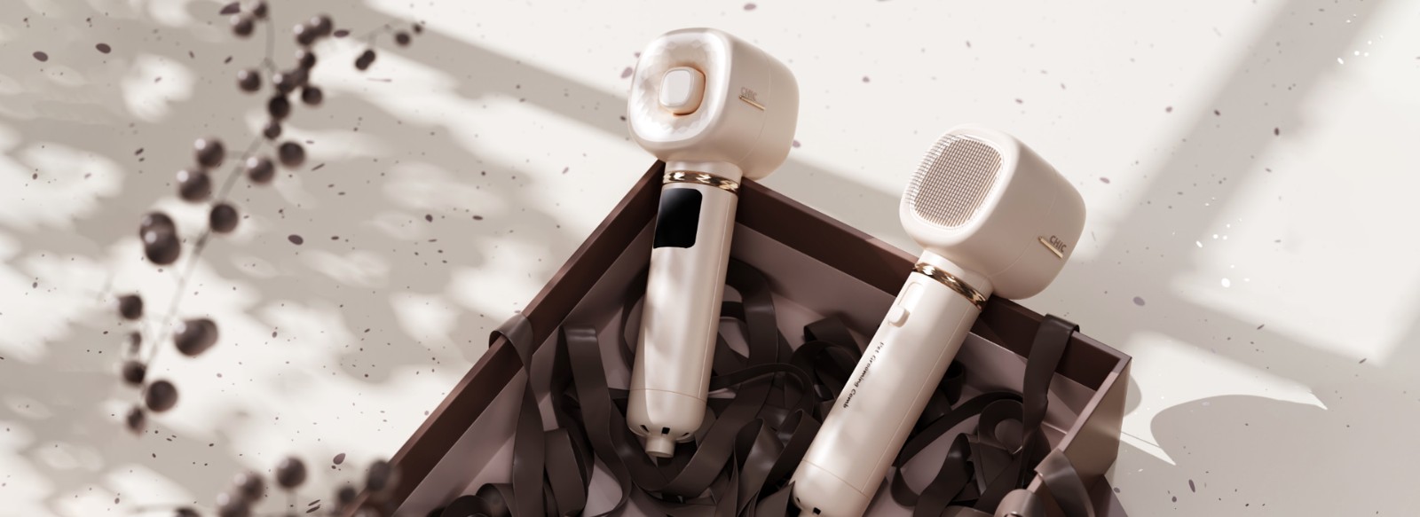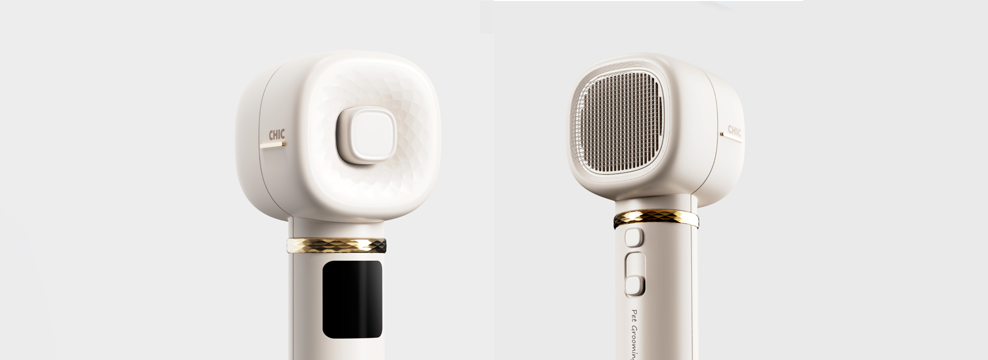 一款智能吹风机产品,宠物清洗后,对于毛发的吹干,方便使用,精致轻奢美学与宠物护理功能的创新融合 轻奢中见实用,精致中含温度